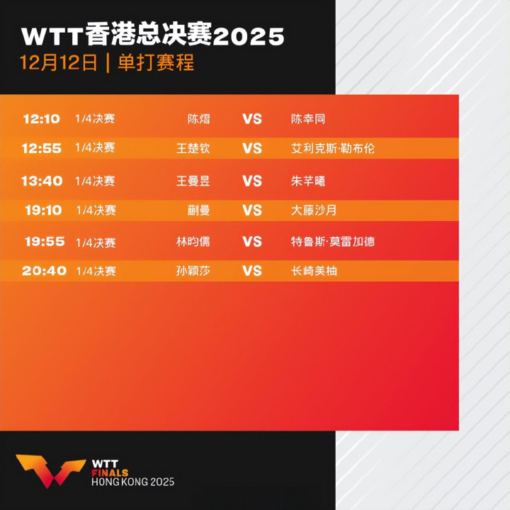 北京时间12月12日消息,2025年WTT香港总决赛进入第三个比赛日的争夺倍悦网,CCTV5、CCTV5+现场直播比赛实况。其中,孙颖莎、王楚钦、蒯曼迎来一日双赛,他们除了出战单打比赛之外,还要出战混合双打,非常考验体能。